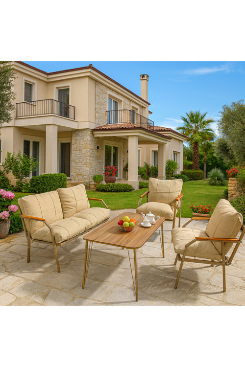 Ufuk Home Linda Cappuccino 211 Masalı Bej Fermuarlı Bahçe Balkon Takımı,Cafe-Metal Kanepe Koltuk Takımı