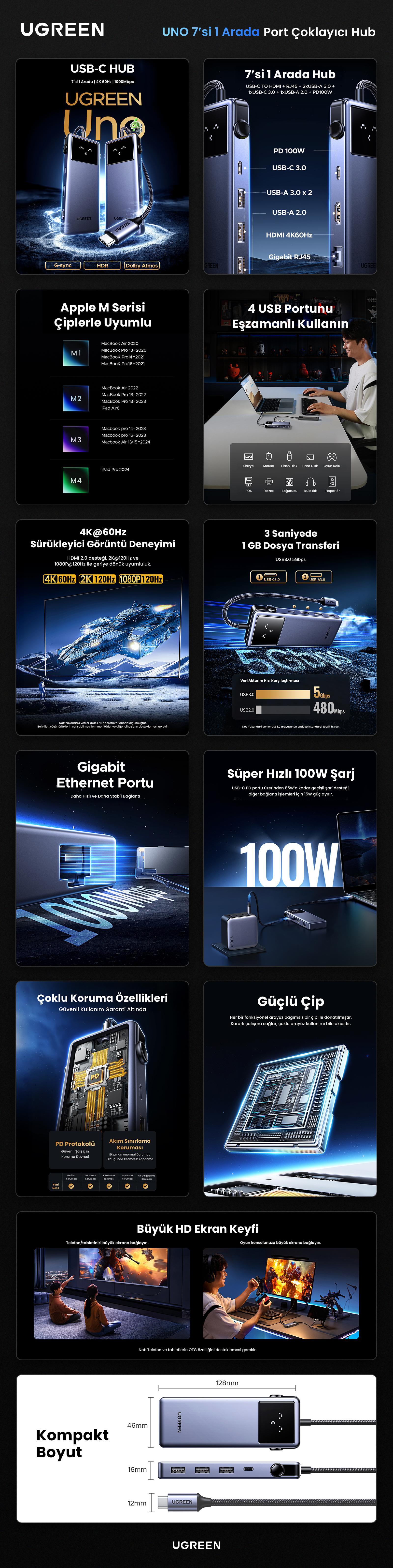 Ugreen 7-in-1 Type-C Giriş 1xUSb-C 100W PD, 1x4K/60Hz HDMI, 1xUSB-A 3.0, RJ45, SD, TF Port Çoklayıcı Hub, 45155
