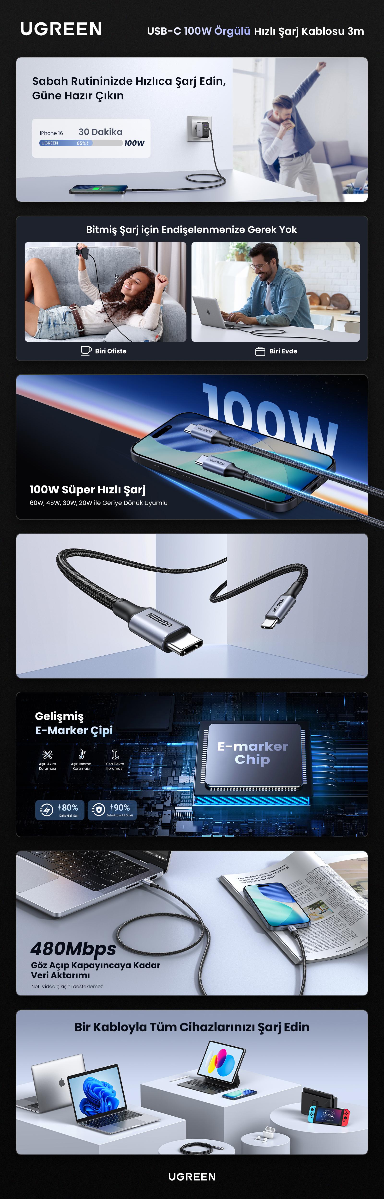 Ugreen USB-C 100W 5A QC PD Örgülü Hızlı Şarj Kablosu, 3 m, Siyah, 90120