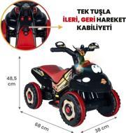 Girişi Ac 220V 50/60Hz. Full Şarjda 40-60 Dk. Kullanım. Çıkışı 6V 1000Ma. Ani Kalkışlarda Devrilmemem Özelliği Süspansiyonlu Ön Tekerlekler. Yüksek Manevra Kabiliyeti. Motor Çalışma Sesi, Korna Sesi Ve 3 Ayrı Müzik Özelliği Gaz Pedalı Kırmızı Ve Mavi Led Işık Özelliği.