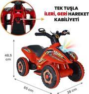 Uj Toys Müzikli ve Led Işıklı Akülü. ATV 6V Safari Özellikleri İlk Arabam Modu. 2'si Bir Arada Kullanım (Akülü, Aküsüz Kullanım) 4 saatte şarj edilmektedir. Saatte 4,5 km/h hıza ulaşmaktadır. 35 kg. taşıma kapasitesi bulunmaktadır. Park etme, ileri, geri gitme özelliği vardır. 3+ yaş içindir. Güç girişi AC 220V 50/60Hz. Full şarjda 40-60 dk. kullanım. Çıkışı 6V 1000mA. Ani kalkışlarda devrilmeme özelliği süspansiyonlu ön tekerlekler. Yüksek manevra kabiliyeti. Motor çalışma sesi, korna sesi ve 3 ayrı müzik özelliği. Gaz pedalı kırmızı ve mavi led ışık özelliği. Ürün ebatları: 65cm x 38cm x 48,5cm. Koli ebatları: 60cm x 30cm x 34cm. Desi: 21 dm3. Ürün demontedir.