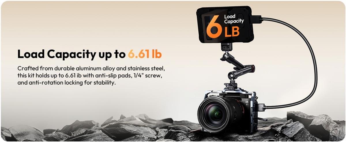 3 kg’a Kadar Taşıma KapasitesiDSLR kamera, LED ışık ve monitör gibi ekipmanları güvenle taşıyabilen sağlam ve dengeli yapı. |