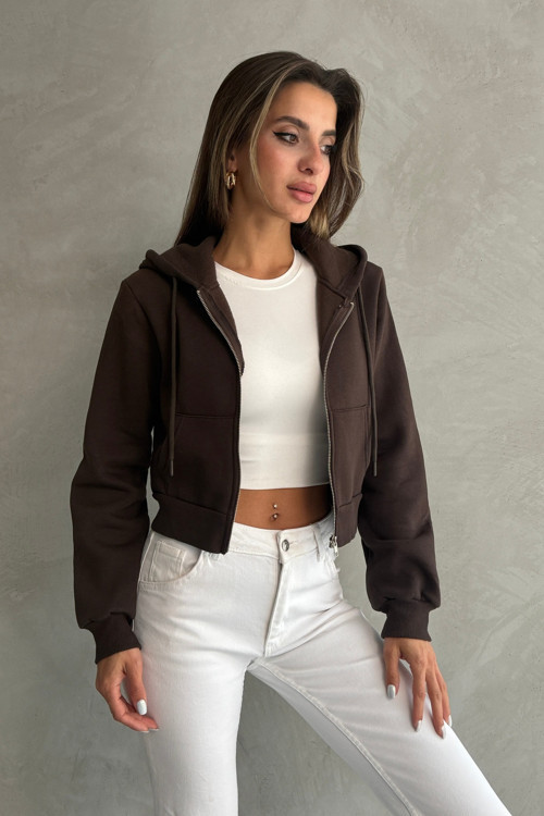 Uzun Kollu Cepli Fermuarlı Crop Örme İçi Şardonlu Kapüşonlu