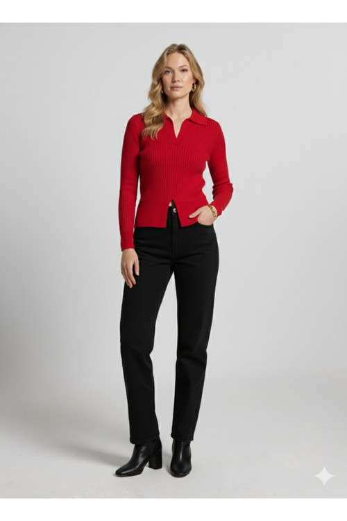 Ulino Uzun Kollu Polo Yakali Alttan Kesik Detayli Fitilli Triko