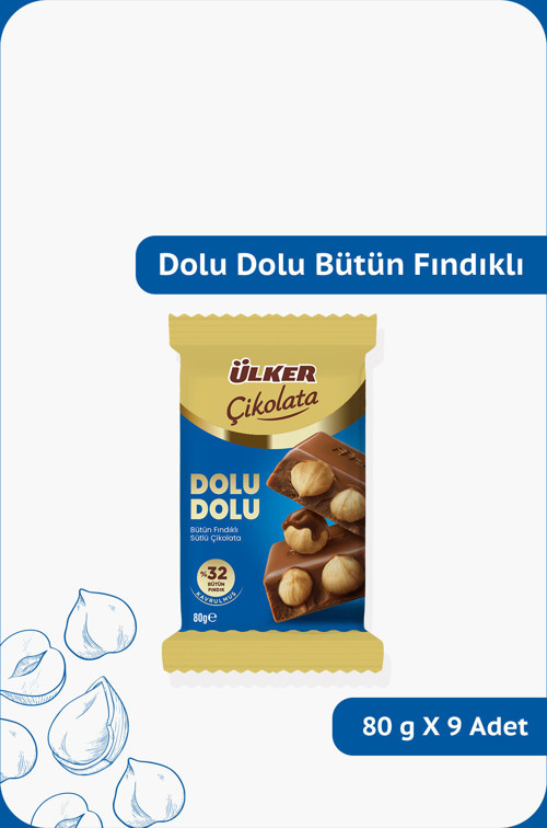 DOLU DOLU %32 Bütün Fındıklı Sütlü Çikolata - 80 gram - 9 Adet