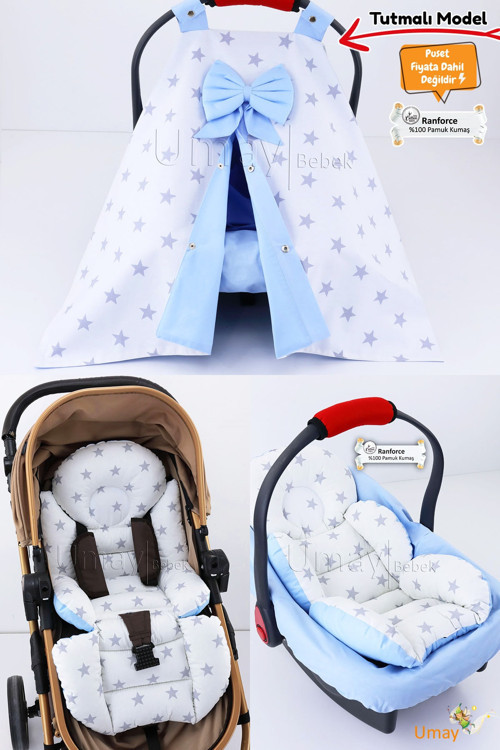 Umay Bebek 3 Parça - Puset Örtüsü, Bel Destekli Puset Minderi, Puset Çarşafı, %100 Pamuk- Tutmalı