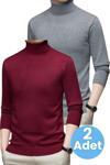Uniquetrenders 2'Li Erkek Tüylenmeyen Boğazlı Triko Kazak Balıkçı Triko Kazak Füme - Bordo 2XL