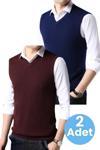 2'Li  Erkek V Yaka Triko Tüylenmez Süveter Erkek Slim Fit Süveter Bordo - Lacivert XL