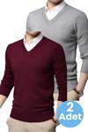 Uniquetrenders 2'Li Erkek V Yaka Uzun Kol Triko Tüylenmez Süveter Erkek Slim Fit Süveter Bordo - Gri S