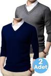 Uniquetrenders 2'Li Erkek V Yaka Uzun Kol Triko Tüylenmez Süveter Erkek Slim Fit Süveter Füme - Lacivert L