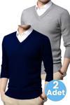 Uniquetrenders 2'Li Erkek V Yaka Uzun Kol Triko Tüylenmez Süveter Erkek Slim Fit Süveter Lacivert - Gri S