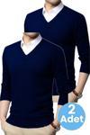 Uniquetrenders 2'Li Erkek V Yaka Uzun Kol Triko Tüylenmez Süveter Erkek Slim Fit Süveter Lacivert - Lacivert XL