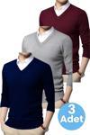 Uniquetrenders 3'Lü Erkek V Yaka Uzun Kol Triko Tüylenmez Süveter Erkek Slim Fit Süveter Lacivert - Gri - Bordo L