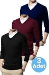 Uniquetrenders 3'Lü Erkek V Yaka Uzun Kol Triko Tüylenmez Süveter Erkek Slim Fit Süveter Siyah - Bordo - Lacivert XL