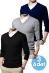 Uniquetrenders 3'Lü Erkek V Yaka Uzun Kol Triko Tüylenmez Süveter Erkek Slim Fit Süveter Siyah - Gri - Lacivert M