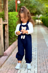 Oliven The Kid 100% Pamuklu Gabardin Licra Mavi Beyaz Çizgili Kedi Nakışlı Kız Çocuk Salopet Mavi