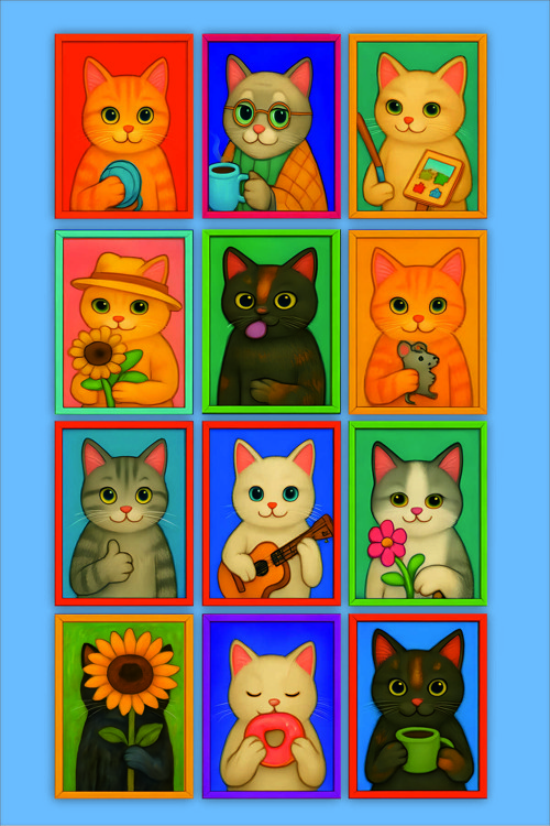Renkli çerçeve görünümüyle görsel bir şölen sunan bu tablolar, kedi severlerin beğenisine hitap eder.