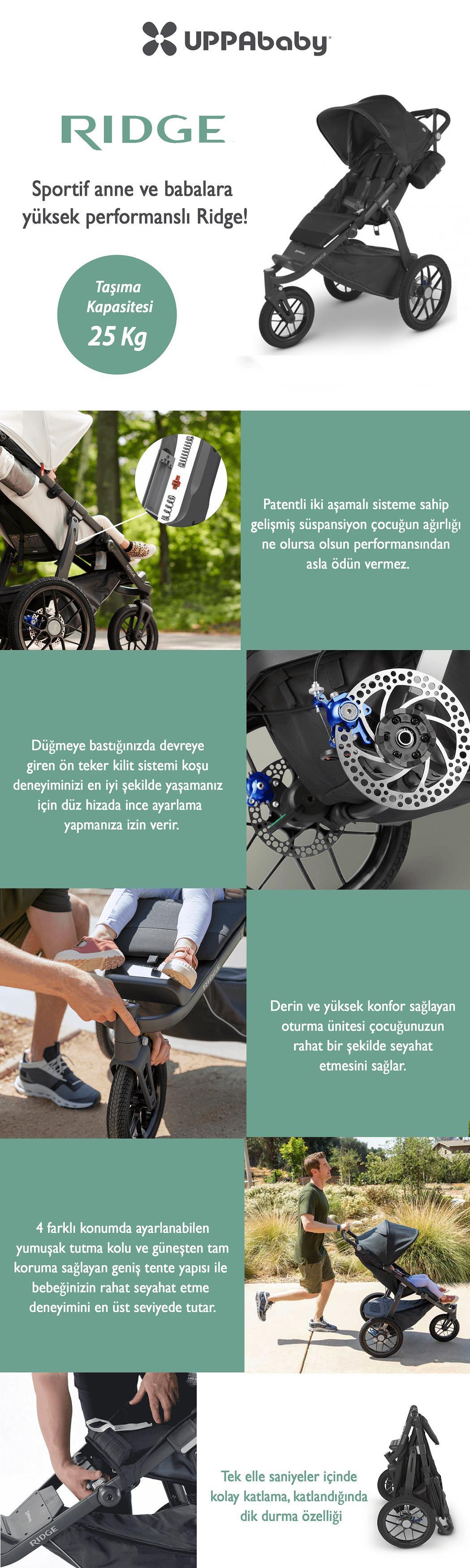 Akıllı, ayarlanabilir, manevra ve yol tutuş özelliği ile sorunsuz bir sürüş sunan Ridge, bebeğinizle konforlu bir gezinti dışında koşu gibi farklı deneyimleri de yaşamanızı sağlar. Özellikle yokuş aşağı koşarken bile yavaşlamanızı sağlayan el freni sistemi üstün güvenlik sunar. Düğmeye bastığınızda devreye giren ön teker kilit sistemi koşu deneyiminizi en iyi şekilde yaşamanız için düz hizada ince ayarlama yapmanıza izin verir.