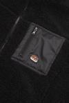 Fermuarlı siyah koyun postu polar kumaş, kontrast polyester yama cep ve mikro enjeksiyon Vaneda markalı yama etiketi.