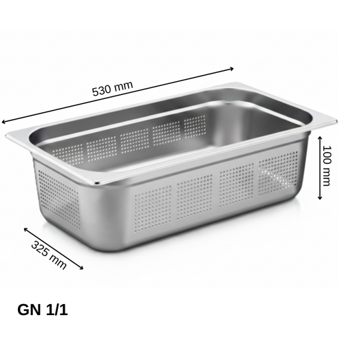 GN 1/1 ölçüsündeki delikli gastronom küvet, profesyonel mutfaklarda orta–yüksek hacimli gıda hazırlama süreçleri için ideal boyut sunar. Gıdaların yıkanması, süzülmesi ve buharda pişirilmesi sırasında fazla sıvının hızla uzaklaştırılmasını sağlayarak ürünlerin daha temiz, diri ve servise hazır kalmasına yardımcı olur. Özellikle sebze, makarna, deniz ürünleri ve haşlanmış gıdalarda düzenli ve kontrollü bir kullanım sağlar.