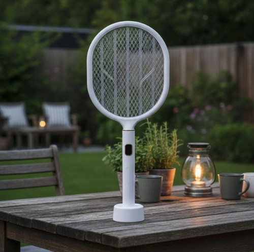 USB Şarjlı Beyaz Renk Kendiliğinden Standlı, Şarj Göstergeli UV Işıklı Sinek Öldürme Raketi