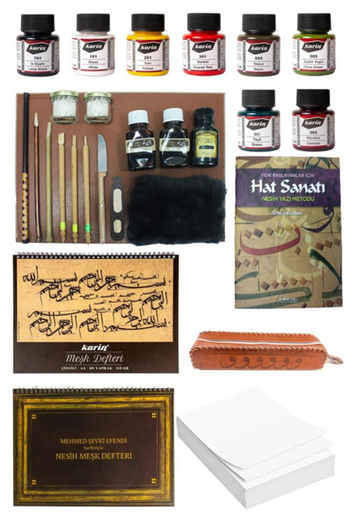 Geleneksel sanatın zarafetiyle tasarlanmış Full Donanımlı Hat Sanatı Seti, el yazısı sanatını modern çağa taşıyor. Kaliteli malzemelerle hazırlanan bu set, estetik ve performansı bir araya getirerek sanatseverleri etkileyici bir deneyime davet ediyor. Hemen keşfedin! SET İÇERİĞİ; ; İRAN İS MÜREKKEBİ SİYAH 1 AD. ; İRAN İS MÜREKKEBİ KIRMIZI(MAVİ) 1 AD. ; İRAN İS MÜREKKEBİ YEŞİL(KAHVE) 1 AD. ; KARİN HAT MÜREKKEBİ 8 AD. ; PROF. HAT BIÇAĞI ; BOYALI KAMIŞ KALEM 2 AD ; STANDART KAMIŞ KALEM 3 AD ; BAMBU KALEM 3 AD ; AHŞAP ŞAKLI KALEM 3 AD. (FARKLI UÇ KALINLIKLARINDA) ; HOKKA + LİKA 6 AD. ; KEMİK İŞLEMELİ MAKTA; 25X35 SUNİ DERİ YAZI ALTLIĞI ; TAVŞAN KILI EL ALTLIĞI ; YENİ BAŞLAYANLAR İÇİN HAT SANATI YAZI METODU; KARİN ÇİZGİLİ MEŞK DEFTERİ ; MEHMET ŞEVKİ EFENDİ HARFLERİYLE NESİH MEŞK DEFTERİ; A4 MAT KUŞE KAĞIT 200 AD ; SUNİ DERİ HAT KALEMLİĞİ;