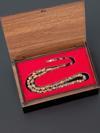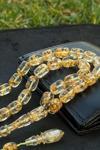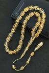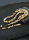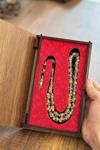 Bu usta işçilikli altın varaklı kapsül tane uçak camı tesbih, özel ahşap kutusunda sunulan, zarif tasarımı ve kusursuz işçiliğiyle göz dolduran bir parçadır. Tesbih, dayanıklı ve parlak uçak camı tanelerinden yapılmış olup altın varak süslemeleriyle tamamlanmıştır.