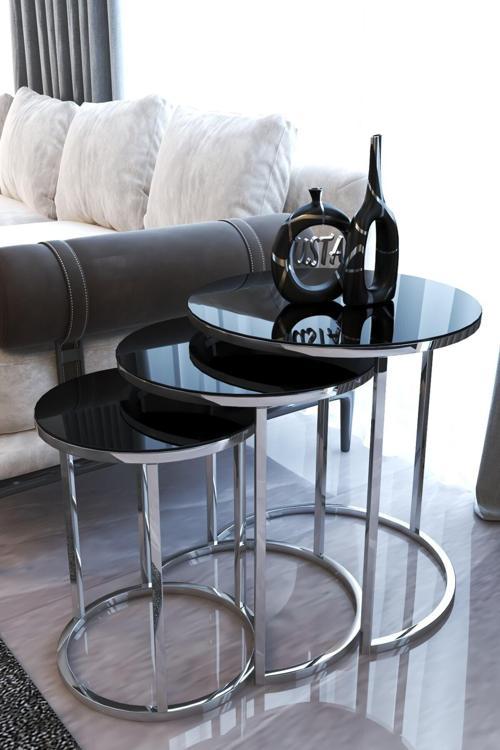 usta mekan Gümüş Metal Zigon Sehpa Kırılmaz Temperli Siyah Cam