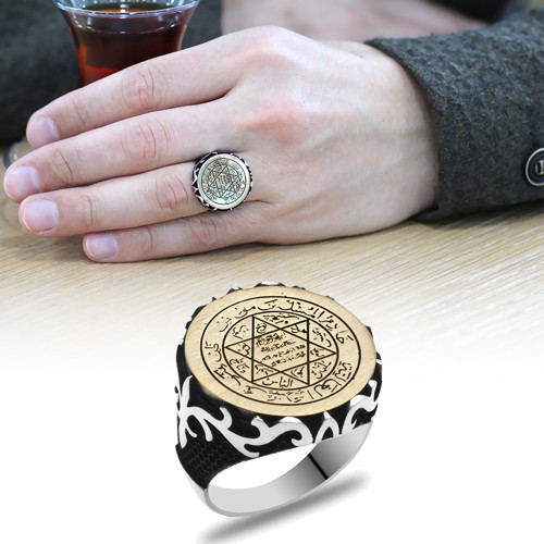 Üzeri Mühr-i Süleyman İşlemeli Kenarları Oksitli 925 Ayar Gümüş Erkek Yüzük