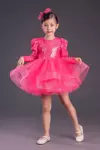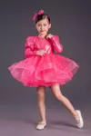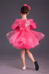 Kız Çocuk Dik Yaka Beli Manşetli Çiçek Detaylı Kuyruklu Kabarık Mercan Abiye - Image 1