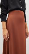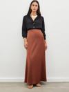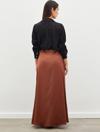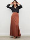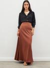 Lastikli bel, arka fermuarlı, uzun saten etek.