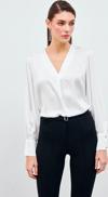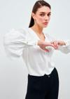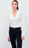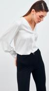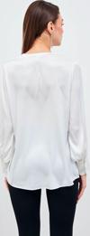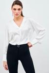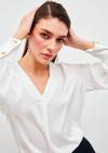 V yaka, uzun manşetli gold düğmeli kol, kalça altı boy, salaş saten bluz.