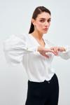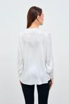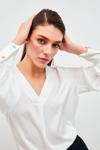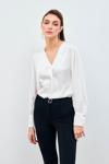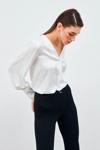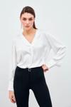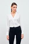 V yaka, uzun manşetli gold düğmeli kol, kalça altı boy, salaş saten bluz.