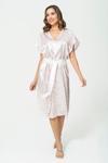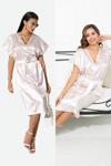 Bu saten takımımız, çok şık bir kemer ve desenli sabahlığın uyumlu birlikteliğinden oluşuyor.
