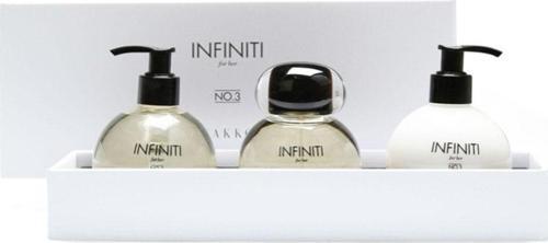 Özel olarak Fransa’da hazırlanan 3 farklı kokusuyla günün farklı anlarına hitap eden Infiniti for Her Eau De Parfum, şimdi body lotion ve duş jeli içeren set formatıyla Vakko dostlarının beğenisine sunuluyor. Feminenlik ve tutku çarpıcı bir şekilde harmanlandı... Esrarengiz paçuli ve pembe biber notaları, taze floral aromalar ile buluştu.