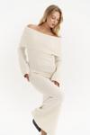 Omuzları açık carmen yaka, yün karışımlı, fitilli, uzun kollu, triko uzun elbise.