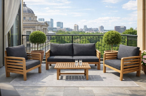 Zerkaconcept Valeri Masif Ahşap Bahçe Balkon Koltuk Takımı Kestane Ağacı 1 adet İkili 2 Adet Tekli ve Sehpa Antrasit