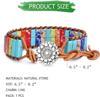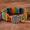 Valkyrie’nin tamamen el işçiliği ile hazırladığı bu doğal taş bileklik; renkli dikdörtgen taşların enerjisini, güçlü dokulu deri ip ile harmanlar. Merkezindeki özel çiçek figürlü metal düğme, tasarıma hem zarafet hem de bohem bir karakter katar.