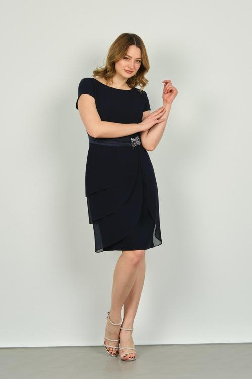 Detay: Şifon, aksesuarlı, yarım kol, astarlı, uzun abiye elbise;