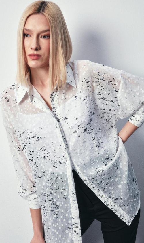 Ön gizli pat, yanlar yırtmaçlı, düşük omuz, ayrı ip askılı astar, varaklı geniş gömlek.