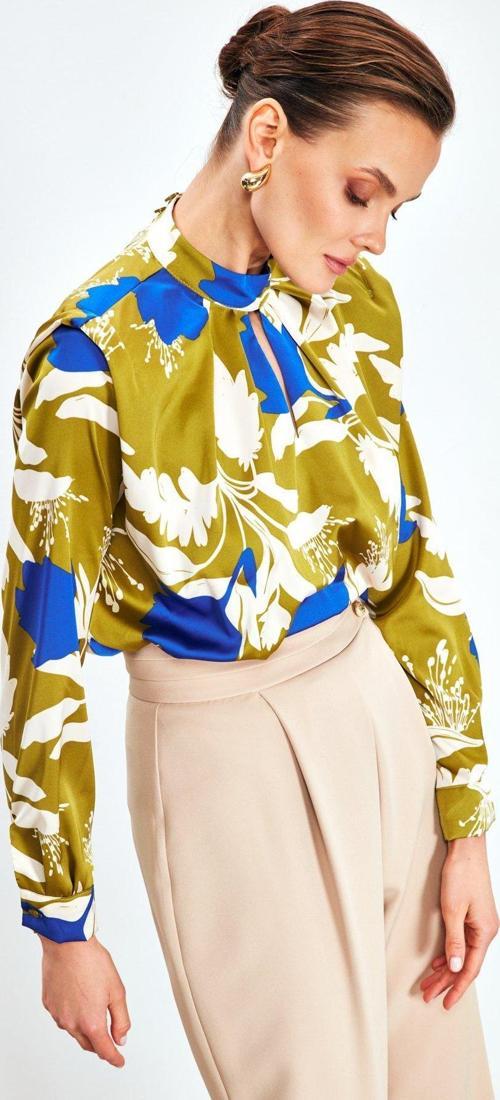 Dik yaka, vatkalı, arka yaka düğmeli kapama, kalça altı boy, desenli saten bluz.