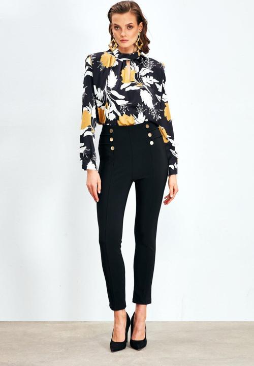Dik yaka, vatkalı, arka yaka düğmeli kapama, kalça altı boy, desenli saten bluz.