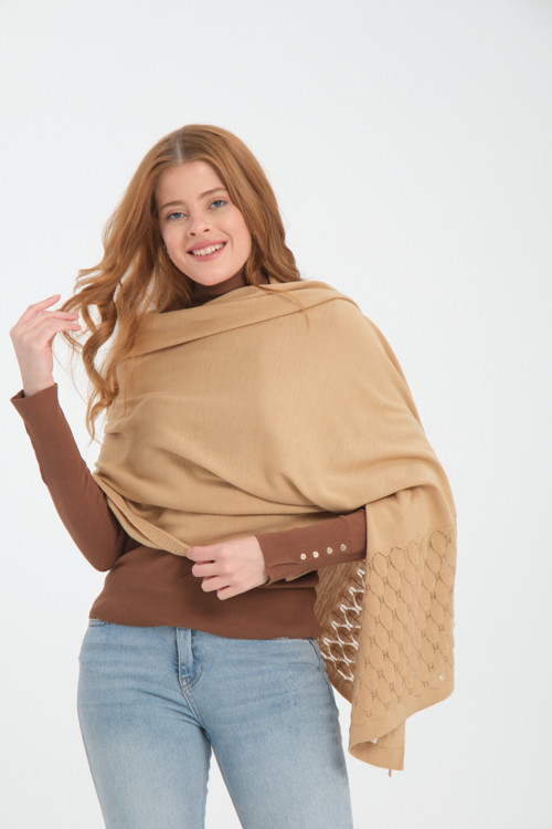 Vega Moda Tek Renk Ajur Desenli Omuz Şalı, Kenarı Ajur Desenli Şık Rahat Omuz Şalı, Triko Omuz Şalı, Kadın Şal