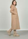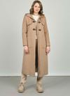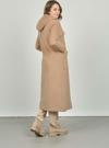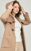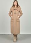 Detay: Kapüşonlu, fermuar ve çengel kapamalı, astarlı, uzun kaban;
