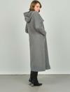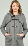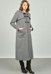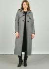 Detay: Kapüşonlu, fermuar ve çengel kapamalı, astarlı, uzun kaban;