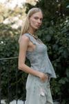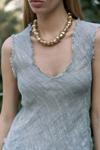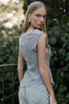 Asimetrik, pis dikiş detaylı, derin 'V' yakalı, transparan keten karışımlı crop.