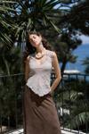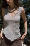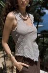 Asimetrik, pis dikiş detaylı, derin 'V' yakalı, transparan keten karışımlı crop.