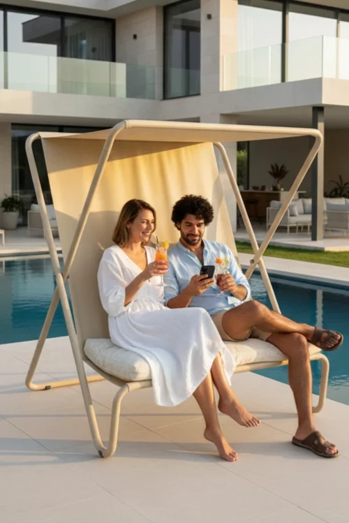Geniş oturum alanı ve ergonomik tasarımı, uzun süreli kullanımlarda bile kesintisiz bir rahatlık sunar. Kalın dolgulu minderi sayesinde, evinizdeki konforu dış mekânlara taşırsınız. Üst kısımda bulunan gölgelik tente ise sizi güneşin zararlı ışınlarından korur ve konforlu bir dinlenme imkanı yaratır.