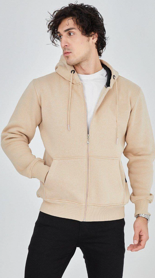 Velmora Premium Erkek Kapüşonlu Düz Fermuarlı Hırka - Bej