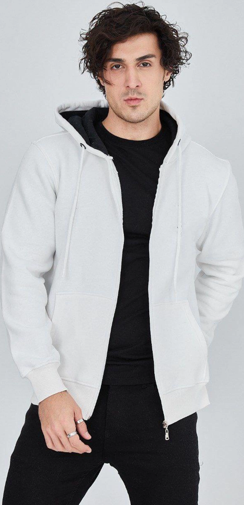 Velmora Premium Erkek Kapüşonlu Düz Fermuarlı Hırka - Beyaz